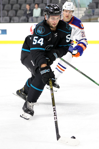 Scott Reedy controls the puck Published October 8, 2022 at 350 × 525 in San Jose Barracuda play pre-season game at new arena Scott Reedy controls the puck – Photo by Jack LimaScott Reedy controls the puck