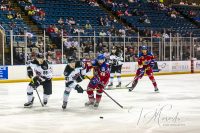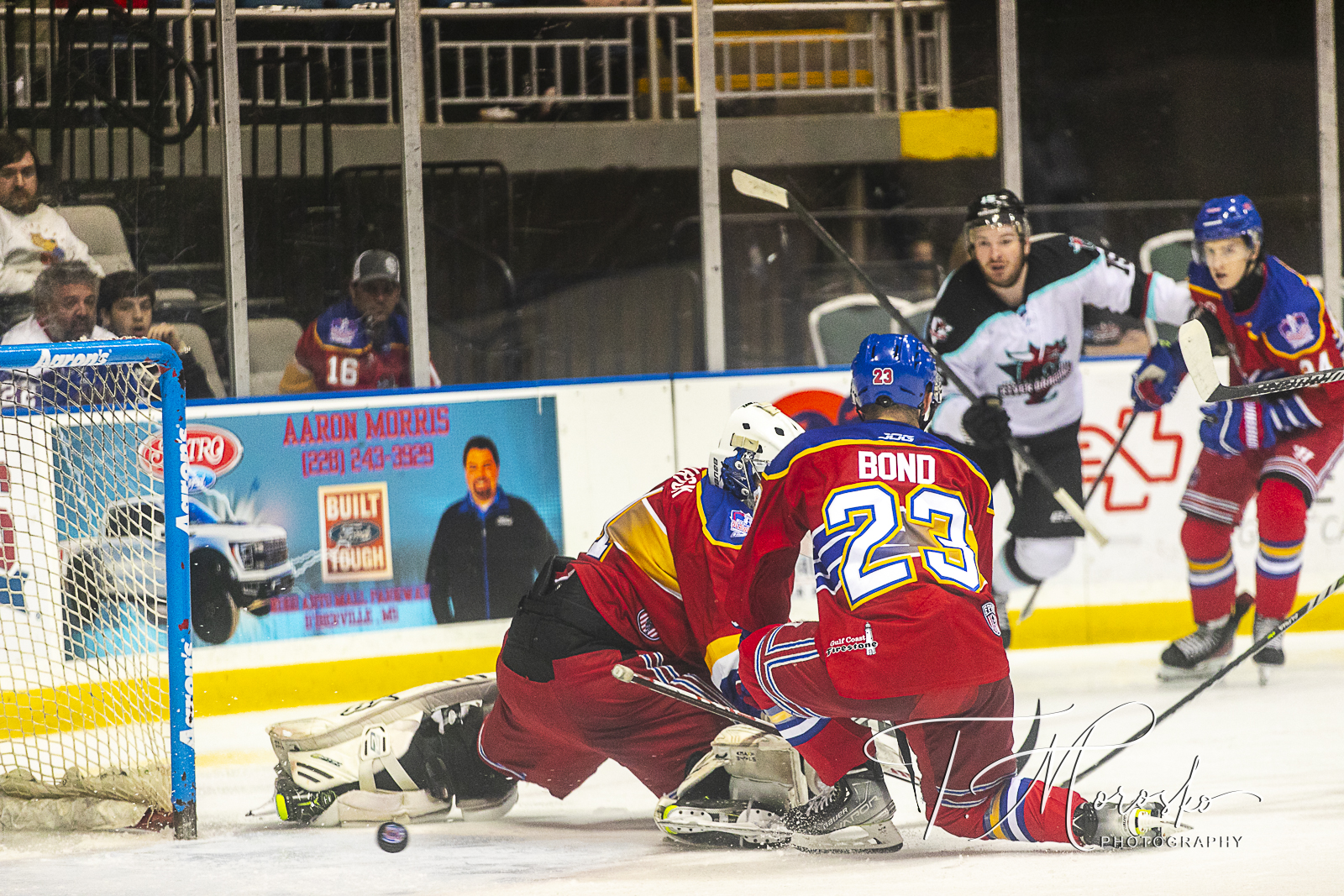 3rd Period was just as explosive and intense as the two periods before it. The teams were playing on their highest level of play that is for sure. Back and forth both teams with goalies making incredible saves and blocks. SOG for each team we were being made and answered by both teams. #1 Blake Weyrick and #30 Talor Joseph were making it very hard for anyone to score. As the action progressed we saw the Sea Wolves get their chances to advance the score with Power Plays coming at 6:49 with #88 Ryan Hunter sitting it out for 2 mins for Slashing. With seconds to go and the goalie signal the return of Hunter to even things up #71 Jmaeff gets sent in for Slashing for 2 mins and that carries over the Power Play for the Wolves. Back up on the even keel of number for players, the game still remains 3-2. Russell gets time for Cross Checking and give the Power Play to Columbus. This worked in favor of the Dragons. at 16:59 Shinkaruk #91 finds a chink in the armor of Weyrick and is able to tie up the game 3-3. The assists went to Alex Jmaeff #71 and Cody Wickline #10. At the sounding of the horn, the game is tied and the game head to overtime.