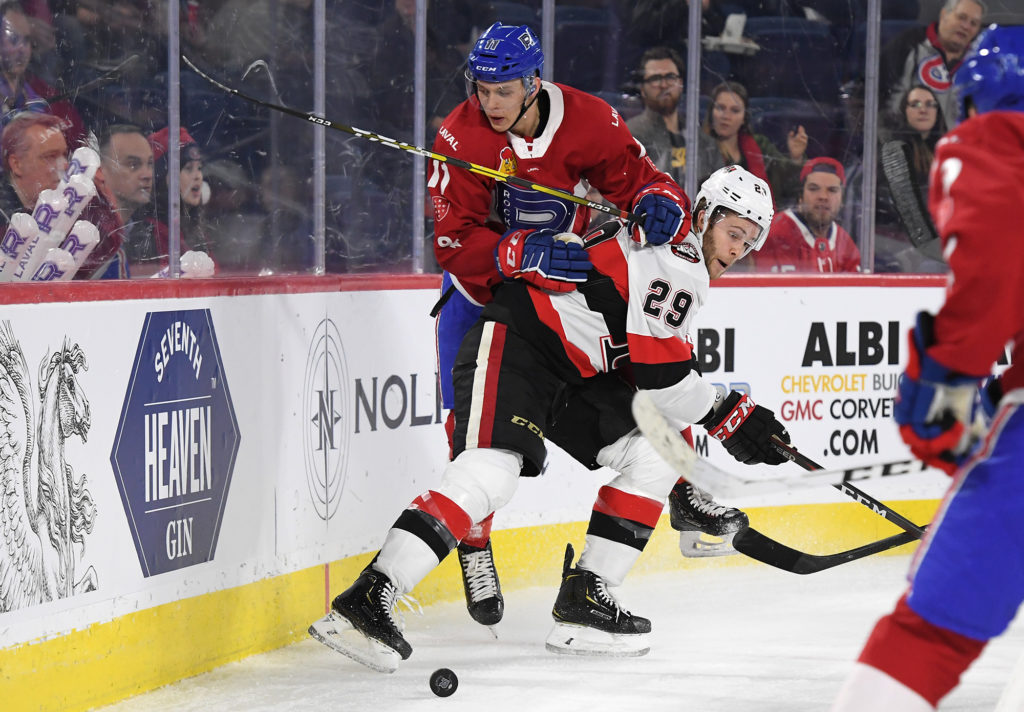 Laval took a 2-1 lead at 2:43 of the second on a short-handed goal by Froese as he converted Alex Belzile’s centering pass on an odd-man rush but the Senators would again find a response as Rodewald converted on the power play. After taking Logan Brown’s pass, Rodewald was stopped by LaCouvee in close but the loose puck hit Laval defenceman Xavier Ouelett and bounced in as the Sens made it a 2-2 game just 49 seconds later.