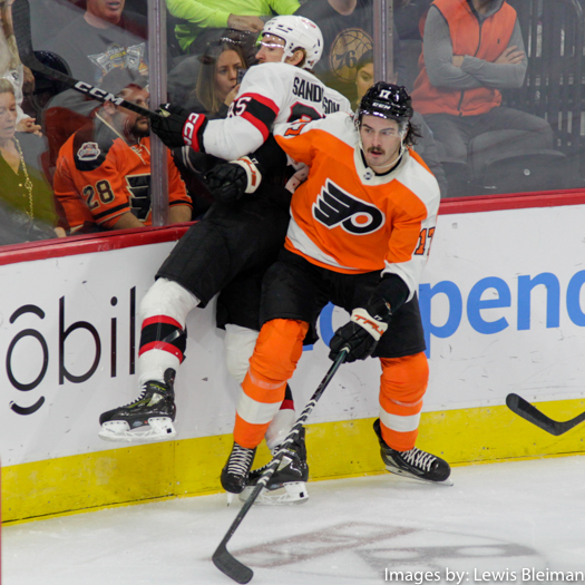 NHL 2022-NOV 12 OTT vs PHI Published November 12, 2022 at 525 × 525 in Senators end skid with 4-1 win over Flyers Jake Sanderson #85 of the Ottawa Senators checked into the glass by Zack MacEwen #17 of the Philadelphia Flyers