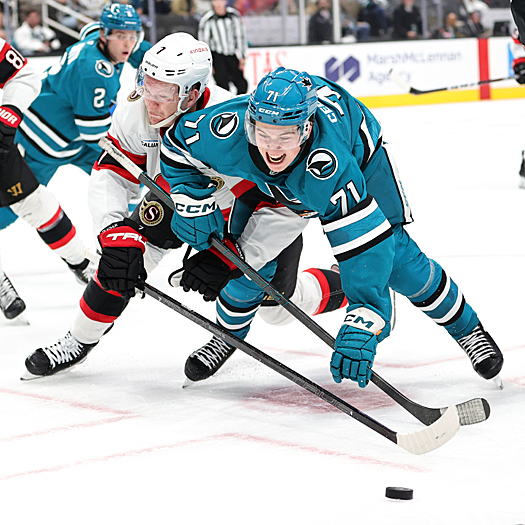 Brady Tkachuk (7) and Macklin Celebrini (71) fight for the puck after a faceoff – Photo by Jack Lima