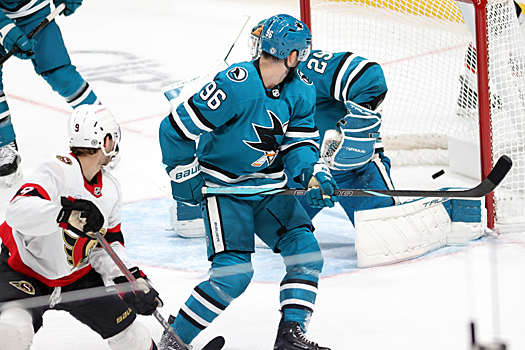 Senators forward Adam Gaudette, left, opens the scoring in the first period with a shot past Sharks goalie Mackenzie Blackwood – Photo by Jack Lima