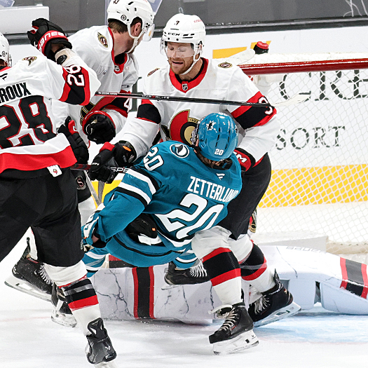 Senators’ defenseman Nick Jensen (3) checks Fabin Zetterlind (20) to the ice during first period action – Photo by Jack Lima