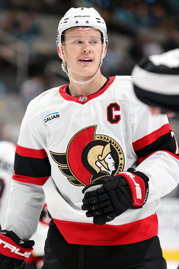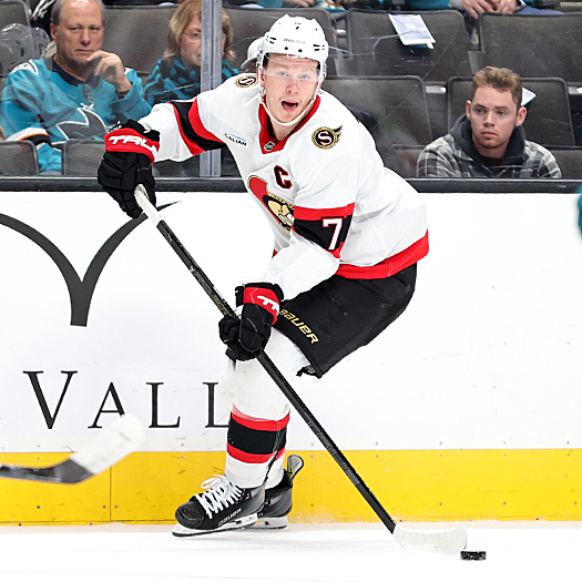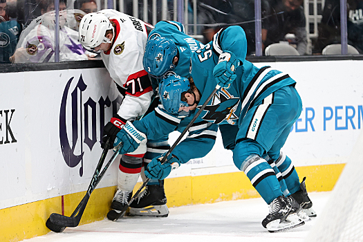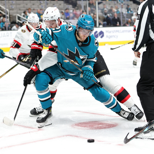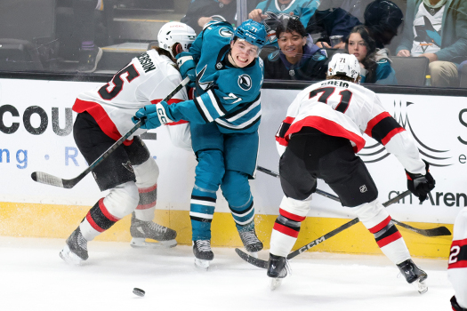 Brady Tkachuk (7) and Macklin Celebrini (71) fight for the puck after a faceoff – Photo by Jack Lima