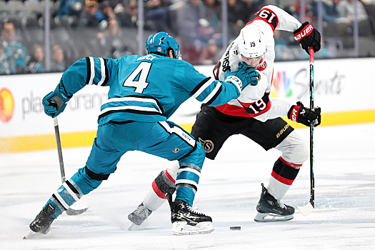 Senators forward Adam Gaudette, left, opens the scoring in the first period with a shot past Sharks goalie Mackenzie Blackwood – Photo by Jack Lima