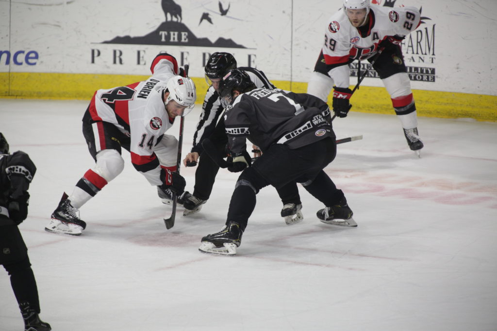 Chase Balisy had the best chance in the first period for Belleville as on a partial break inside the last three minutes of the period, he couldn’t slide a backhander past McIntyre who got left pad down for the save.