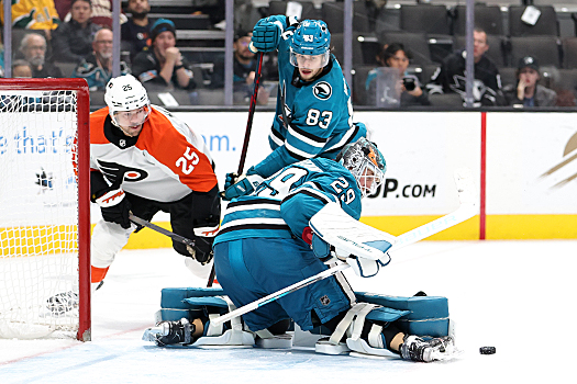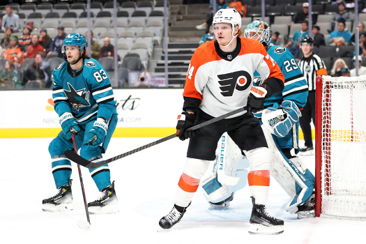 Flyers forward Owen Tippett (74) gets position in front of Sharks goalie Mackenzie Blackwood as Sharks defenseman Nikita Okhotiuk (83) defends – Photo by Jack Lima