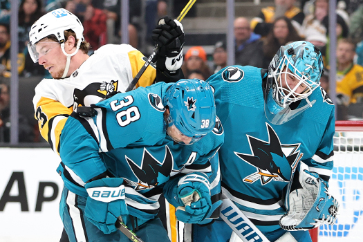 Brock McGinn (left) Mario Ferraro (38) and Aaron Dell (right) duck to avoid a shot on goal Published February 15, 2023 at 525 × 350 in Sharks fall to the Penguins Brock McGinn (left) Mario Ferraro (38) and Aaron Dell (right) duck to avoid a shot on goal – Photo by Jack Lima