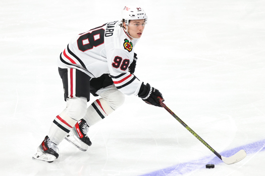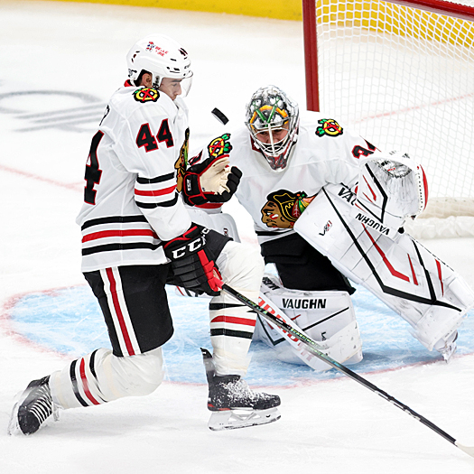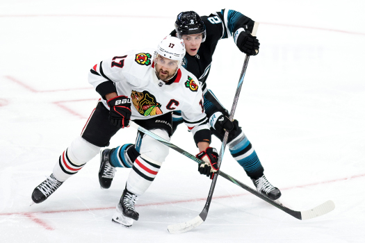Blackhawks Nick Foligno (17) and Tyler Bertuzzi (59) look for a pass as Sharks Jake Walman (96) and Cody Ceci (4) defend – Photo by Jack Lima