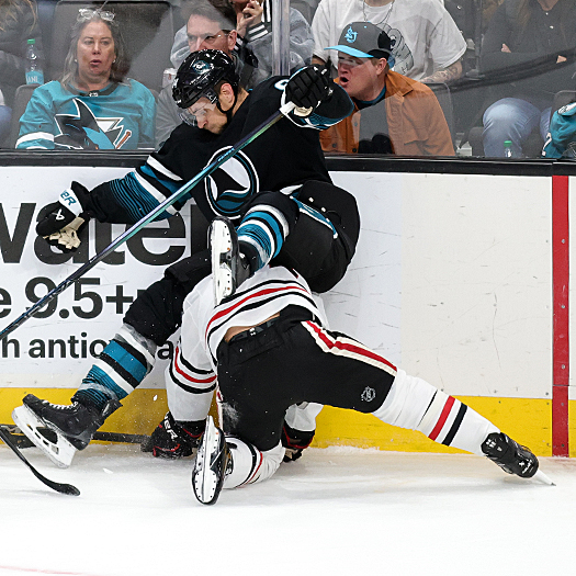 Sharks Barclay Goodrow (23) jumps to avoid being hit by a shot as Connor Murphy (5) defends in front of goalie Petr Mrázek – Photo by Jack Lima