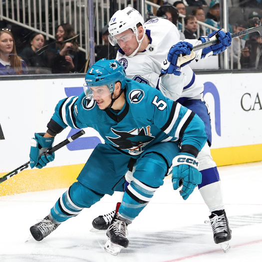 Sharks defenseman Jaycob Megna (24) reaches for a loose puck into front of Brayden Point (21) – Photo by Jack Lima