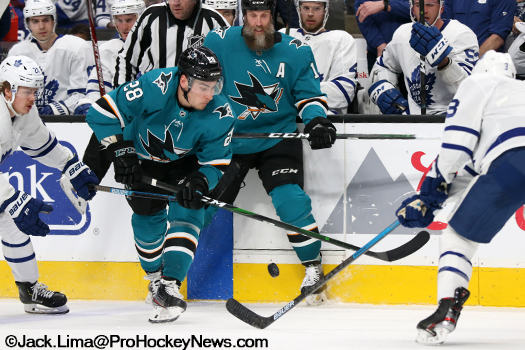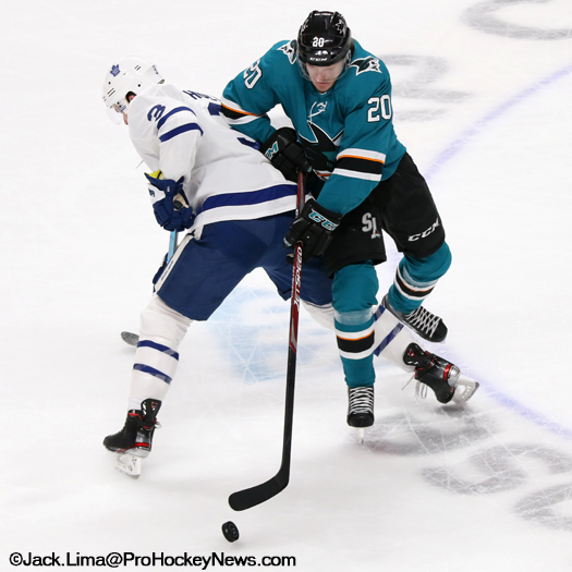 SAN JOSE – Evander Kane struck twice Tuesday night for the Sharks as they popped in three goals in the third period to defeat the Toronto Maple Leafs, 5-2,.