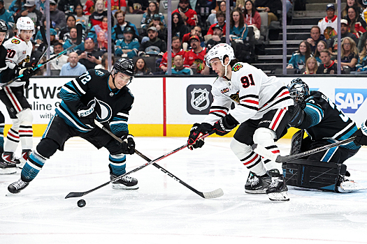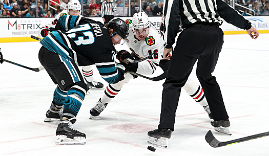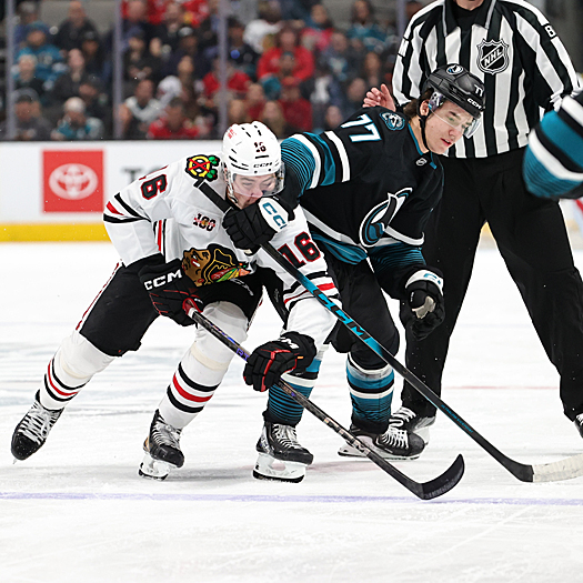 Sharks Tyler Toffoli (73) and Blackhawks Anton Frondell (16) follow the puck after their faceoff – Photo by Jack Lima