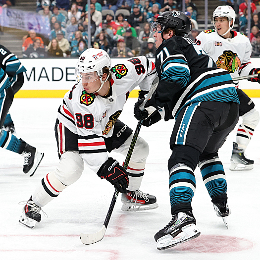 Blackhawks center Connor Bedard and Sharks Maklin Celebrini (71) follow the puck after a faceoff – Photo by Jack Lima