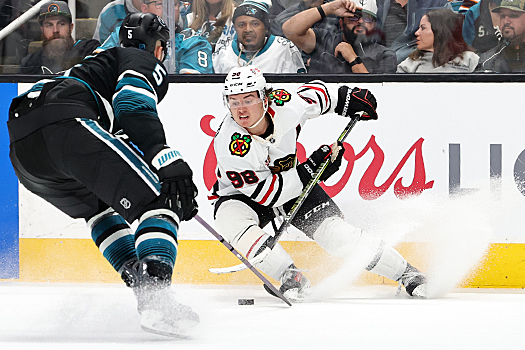 Blackhawks center Connor Bedard attempts to move around Sharks defenseman Vincent Desharnais (5) – Photo by Jack Lima