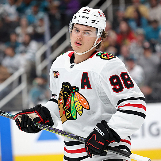 Blackhawks center Connor Bedard takes a shot on goal during first period action – Photo by Jack Lima