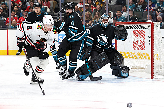 Blackhawks center Ryan Donato (8) chases the puck in front of Sharks defenseman Vincent Desharnais (5) and goalie Alex Nedeljkovic – Photo by Jack Lima