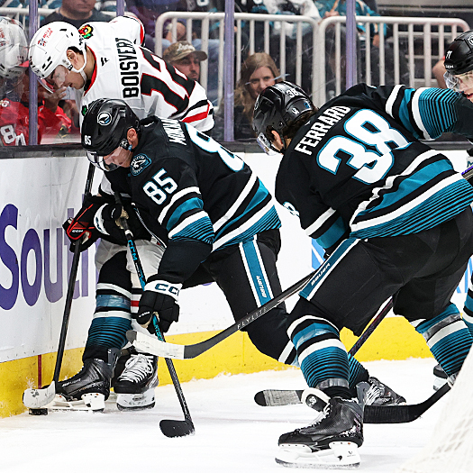 Sharks defenseman Shakir Mukhamadullin (85) fights Blackhawks center Sacha Boisvert (12) for the puck behind the net – Photo by Jack Lima