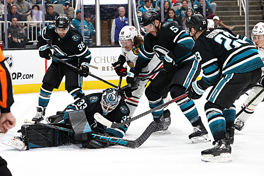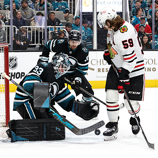 Sharks forward William Eklund (72) and Blackhawks Frank Nazar (91) fight for the puck in front of Sharks goalie Alex Nedeljkovic – Photo by Jack Lima