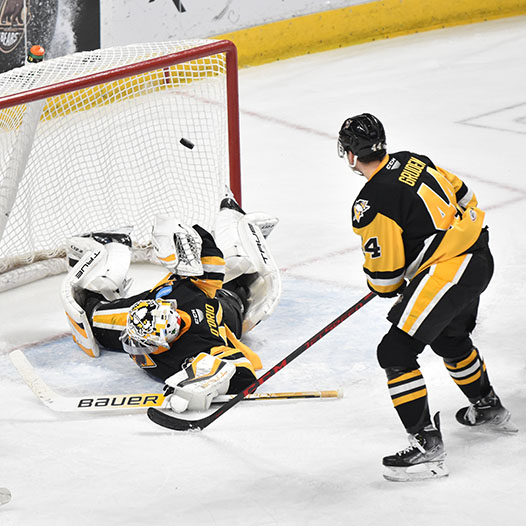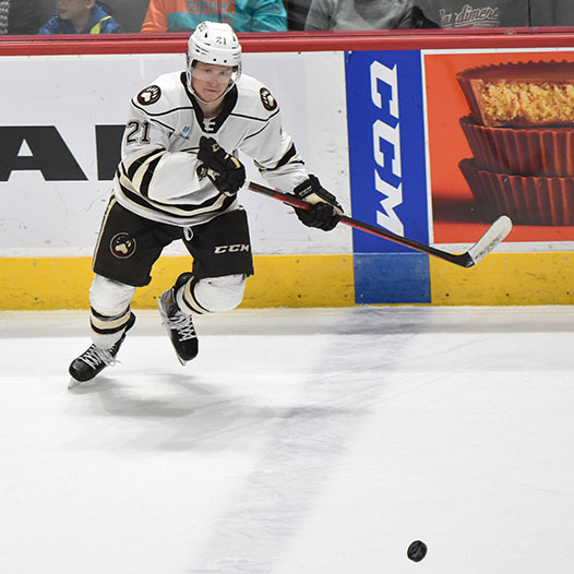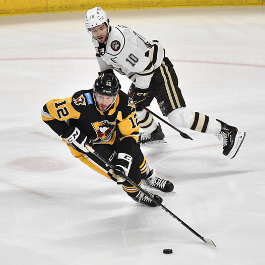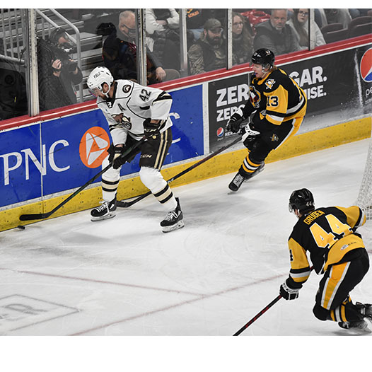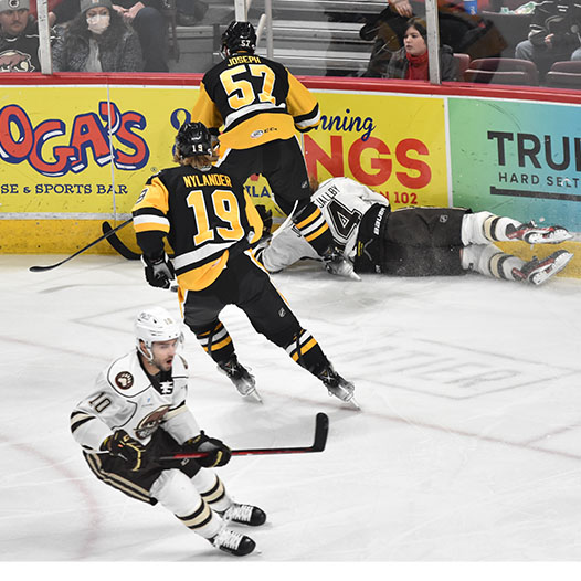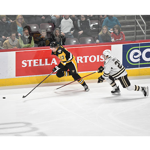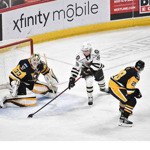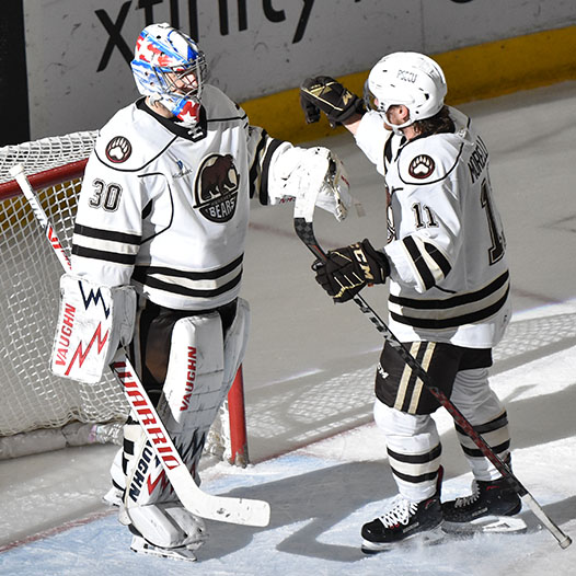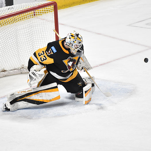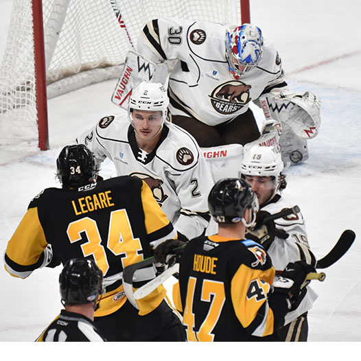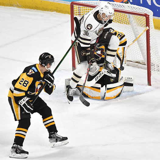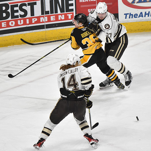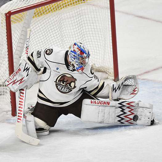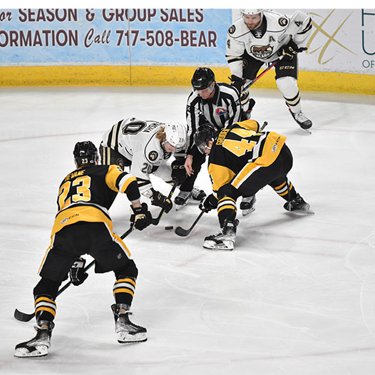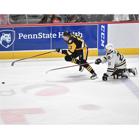 The Bears went to work on a 5-on-3 power play late in the second period and seized the opportunity to add insurance. At the 14:51 mark, Mike Vecchione roofed a shot from the left face-off circle past Pens goaltender Alex D’Orio. Hershey carried a 2-0 lead into the second intermission with a 23-16 shots advantage.