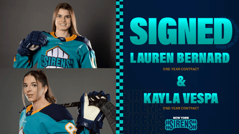 NEW YORK – The New York Sirens announced Friday that the team has re-signed defender Lauren Bernard and forward Kayla Vespa to one-year Professional Women’s Hockey League (PWHL) Standard Player Agreements for the 2025-26 season.
