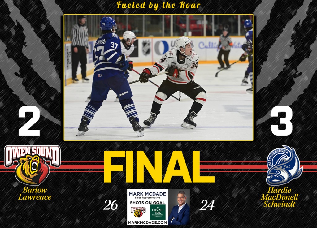 It was a sluggish start to a game that saw an intense final minute push, as the Owen Sound Attack were unable to complete a two-goal comeback and fell 3-2 Friday night in Mississauga in their second of two meets against the Steelheads this season.
