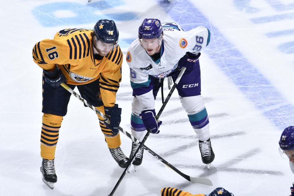 Orlando’s Alex Schoenborn (right) and Norfolk’s Connor Hurley line up for a faceoff during Thursday night’s game (Photo courtesy of Fernando Medina / Orlando Solar Bears)