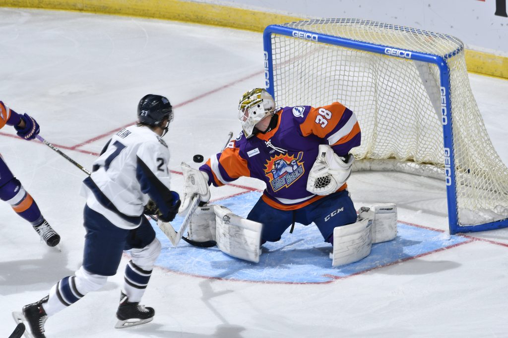 Orlando goalie Clint Windsor (38, purple) denies a shot by Jacksonville’s James Phelan during Tuesday’s first period (Photo courtesy of Fernando Medina / Orlando Solar Bears)