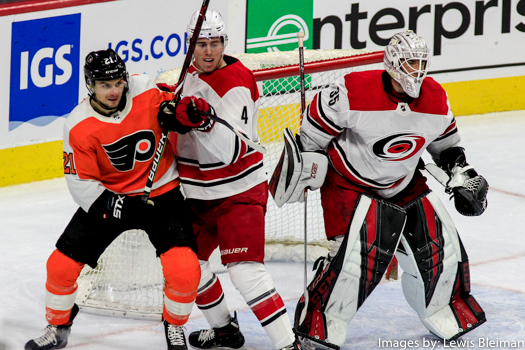 Center Scott Laughton (#21) of the Philadelphia Flyers battles for position with Defenseman Haydn Fleury (#4) of the Carolina Hurricanes