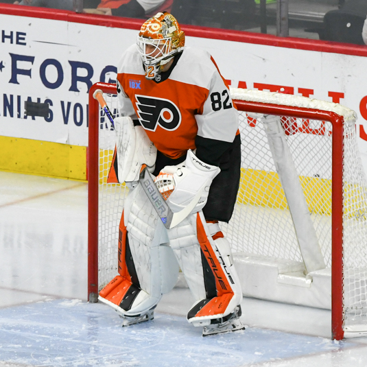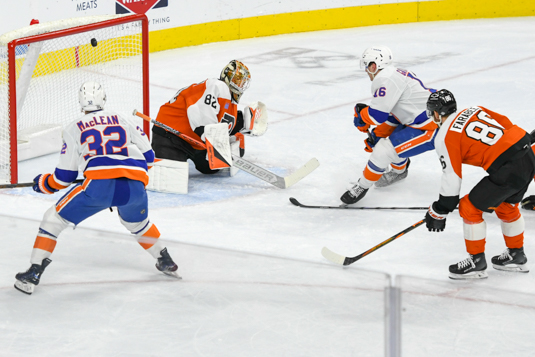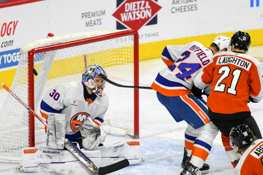 Goalie Ilya Sorokin #30 of the New York Islanders uses his stick and glove to cover the puck from the Philadelphia Flyers Tyson Foerster #71.