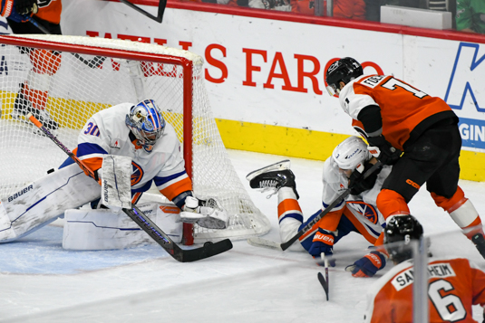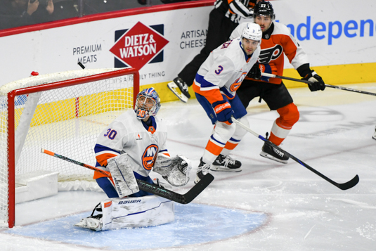Adam Pelech #3 of the New York Islanders and Noah Cates #27 of the Philadelphia Flyers and goalie Ilya Sorokin #30 of the New York Islanders