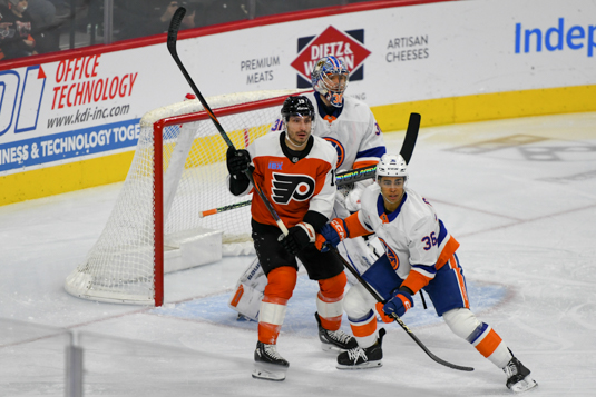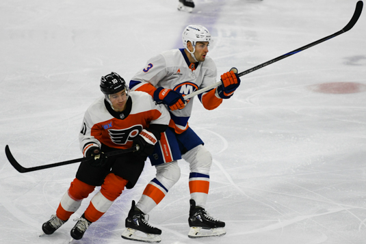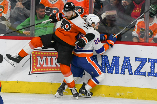 Sean Couturier #14 of the Philadelphia Flyers checks Scott Perunovich #26 of the New York Islanders during the second period.