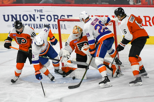 Philadelphia Flyers and New York Islander players scramble for the puck in front of goalie Ivan Fedotov #82 of the Philadelphia Flyers