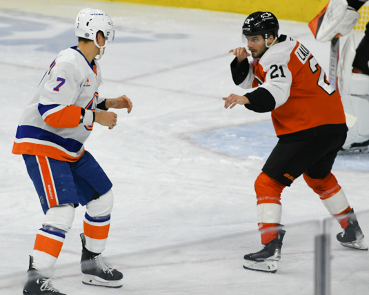 Maxim Tsyplakov #7 of the New York Islanders and Scott Laughton #21 of the Philadelphia Flyers square of after a face-off