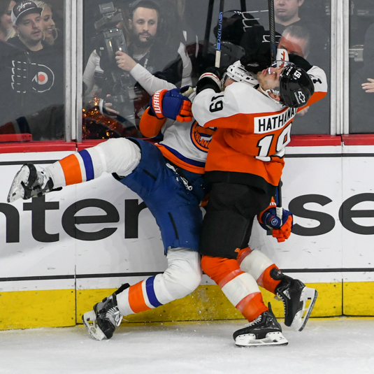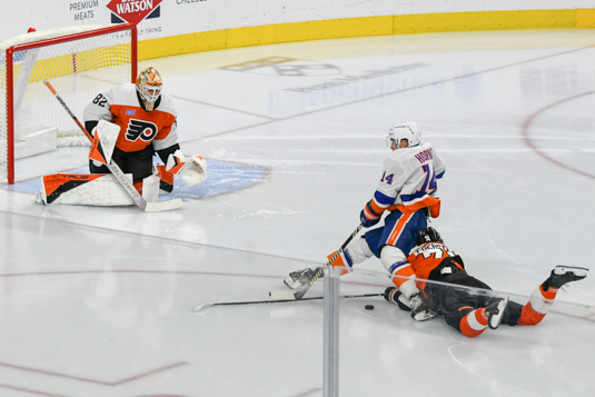 Philadelphia Flyer Tyson Foerster #71 earns a tripping penalty against Bo Horvat #14 of the New York Islanders