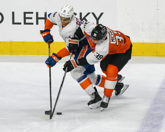 Isaiah George #36 of the New York Islanders fights for positions with Garnet Hathaway #19 of the Philadelphia Flyers