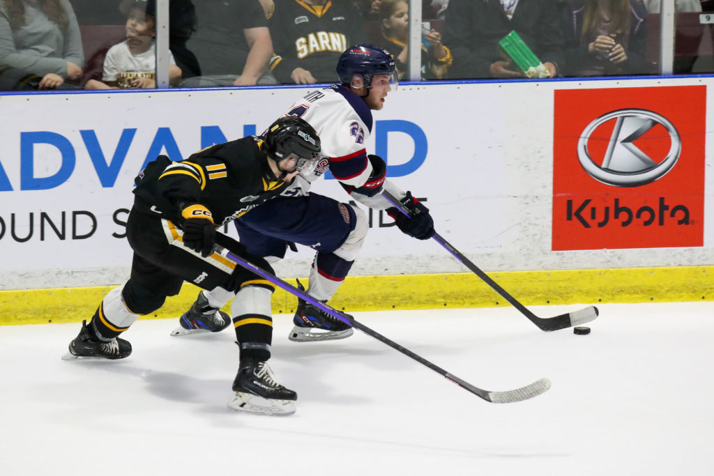 Matyas Sapovaliv scored the game-tying goal with time winding down while Tristan Lennox stopped 45 of 47 shots faced for Saginaw. Benjamin Gaudreau earned his seventh win of the postseason for Sarnia by stopping 33 of 34. Ty Voit netted a goal and an assist for the Sting while Luca Del Bel Belluz tallied the game winner.