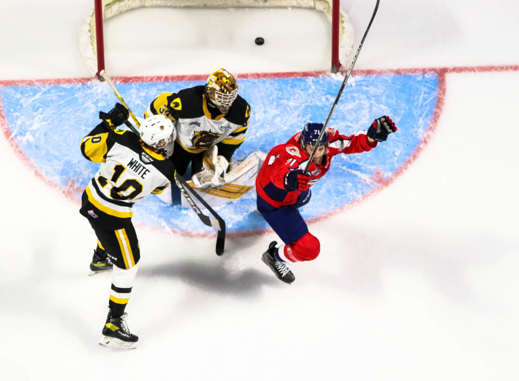HAMILTON, ONTARIO. After splitting the first two games of the OHL Finals in Hamilton, the Bulldogs travelled West down the 401 to the WFCU Centre for Game 3 on Monday night, looking to take home ice advantage back in their favour.