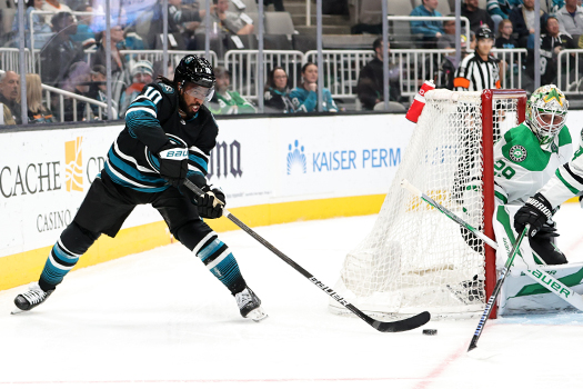 Ryan Carpenter’s (not pictured) shot eludes Stars goalie Jake Oettinger to give the Sharks a 3-2 lead – Photo by Jack Lima