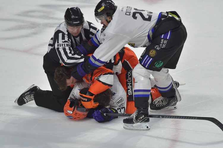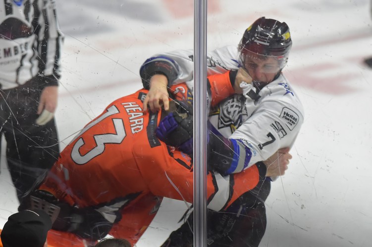 The period ended with a heated confrontation in front of the net, drawing several players and resulting in 26 penalty minutes. Heard and Clavelle tangled, while Tansey clashed with Welsh and Cutler. As things calmed and the faceoff was being prepared, Welsh received an additional 10-minute misconduct for something said while he was in the box.