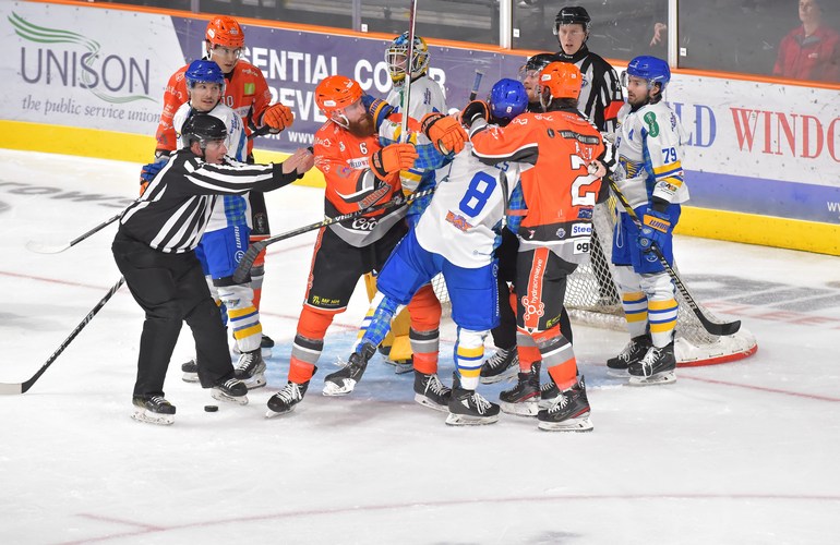 The Steelers moved 5-3 ahead when Fife were called for two minors on the same play – Owen for Tripping and Humitz Holding. Having nearly seen off the 5-on-3, Brett Neumann tipped Patrick Walting’s shot with five seconds left of the two-man advantage top ut the hosts back two ahead. Anthony Eriksson fed Lucas Chiodo for a well-taken odd-man rush goal two minutes later to again pull the Flyers back to within one, but the visitors were undone on a powerplay as Giles struggled to keep the puck in the zone, and Mark Simpson raced away to feed Brandon Whistle for the finish on a 2-on-0 shorthanded rush. Simpson added a late empty netter as the Flyers took Owen out to complete a 7-4 win.
