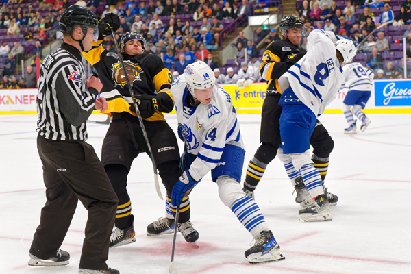 Brampton and Brantford exchanged penalties when Noah Roberts was caught for a hook, before Porter Martone was called for a high-sticking double-minor.