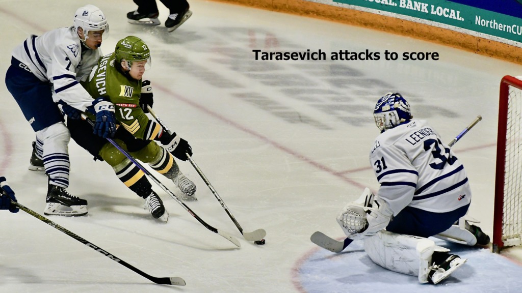 Having trailed 1-0 through 20 minutes, the Battalion tied it when Tarasevich, on his backhand, drove down the left wing fending off Finn Harding and jammed the puck home from the crease at 2:07 of the middle period. Bloom, with his first OHL playoff assist, and Luc Brzustowski set up the play for Tarasevich’s first OHL playoff marker.