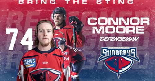 NORTH CHARLESTON, SC − The South Carolina Stingrays, proud ECHL affiliate of the NHL’s Washington Capitals and AHL’s Hershey Bears, have agreed to terms with defenseman Connor Moore for the 2021-22 season.