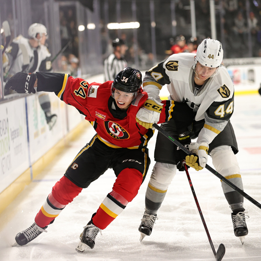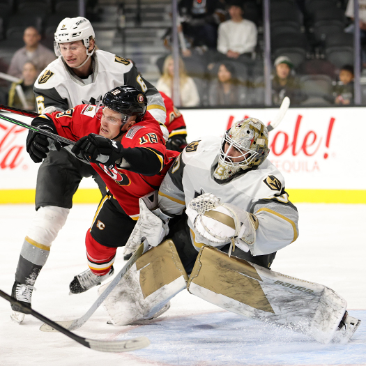 HENDERSON, Nev. – The Stockton Heat (43-12-6) inched two additional points closer to hopes of securing the Pacific Division Title, and a first-round bye in the playoffs, with an overtime win 4-3 over the Henderson Silver Knights (29-28-5). The Heat have a magic number of six now. The Silver Knights had a commanding 3-1 lead midway through the third period, but were not able to close the deal, before a home crowd of 4,864.