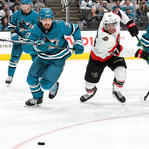 Senators center Lars Eller (89) battles Sharks center Philipp Kurashev (96) for control of the puck – Photo by Jack Lima