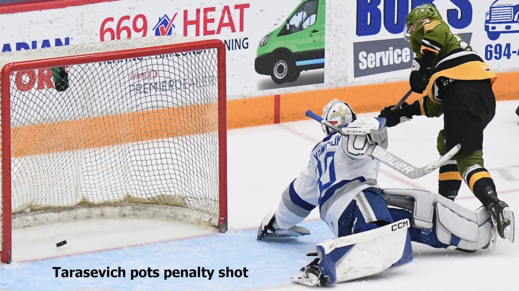Penalty killer Tarasevich was awarded the penalty shot when he was hooked by Pharand on a breakaway at 10:26 of the second period. Tarasevich swept in on the net from the left side and put a forehand deke on Krawchuk for a ninth goal on the season.