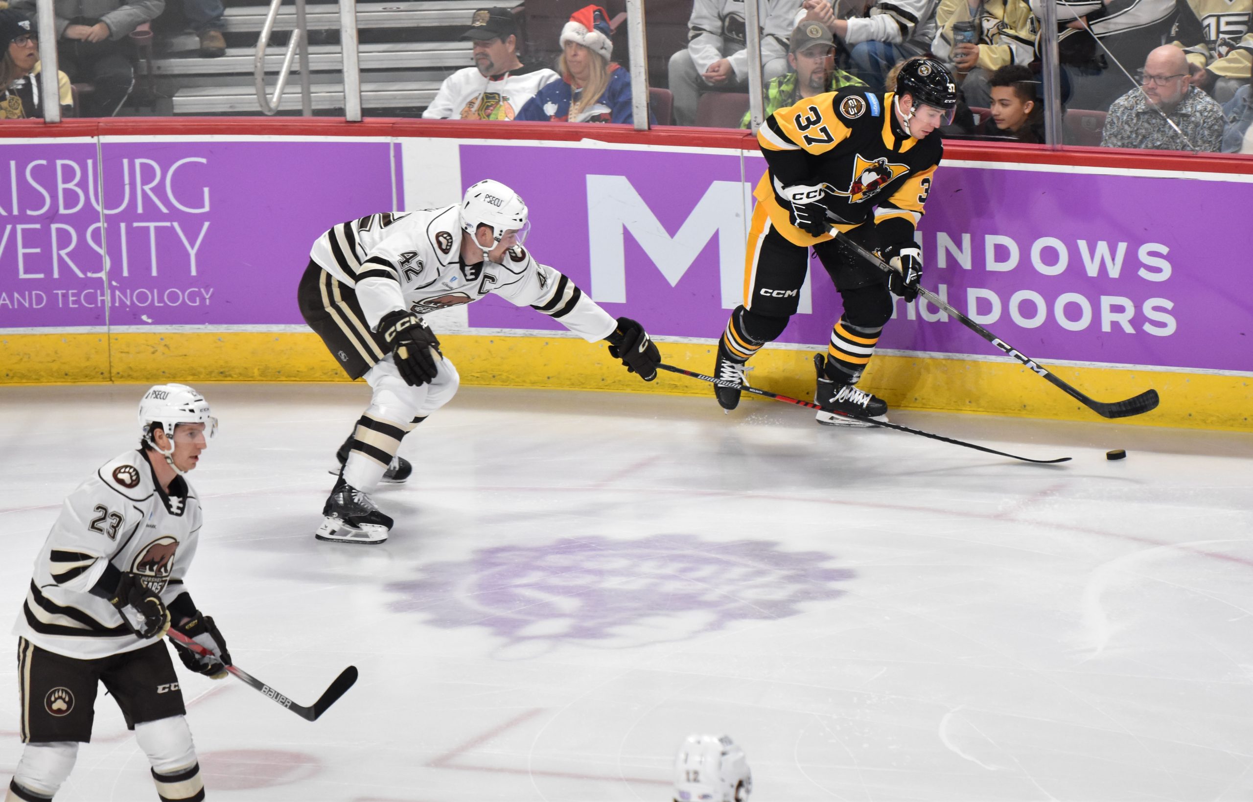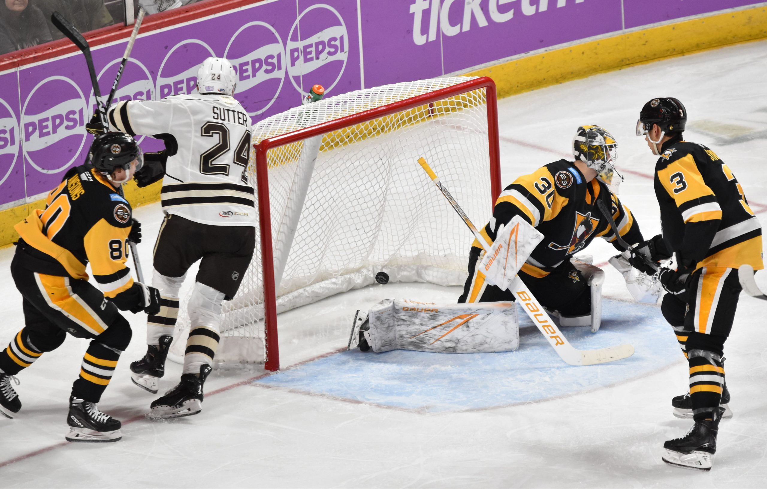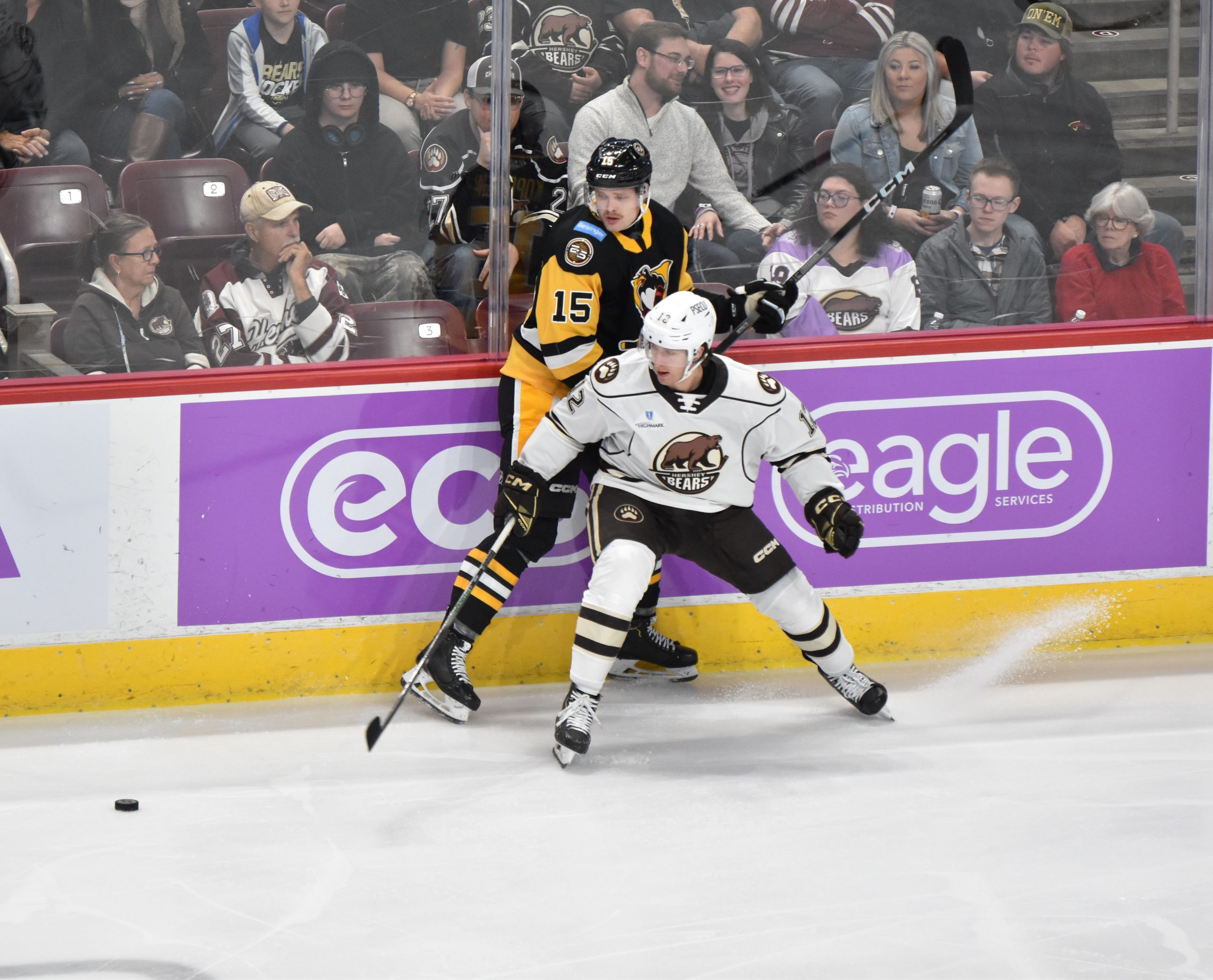 Riley Sutter broke a 1-1 tie in the second period to give the Hershey Bears (13-4-0-0) a 2-1 Thanksgiving Eve home win over the Wilkes-Barre/Scranton Penguins (8-6-2-0) on Wednesday night in front of a crowd of 9,259 at GIANT Center. Hershey improved to 3-2-0-0 in the season series with Wilkes-Barre/Scranton with the victory.