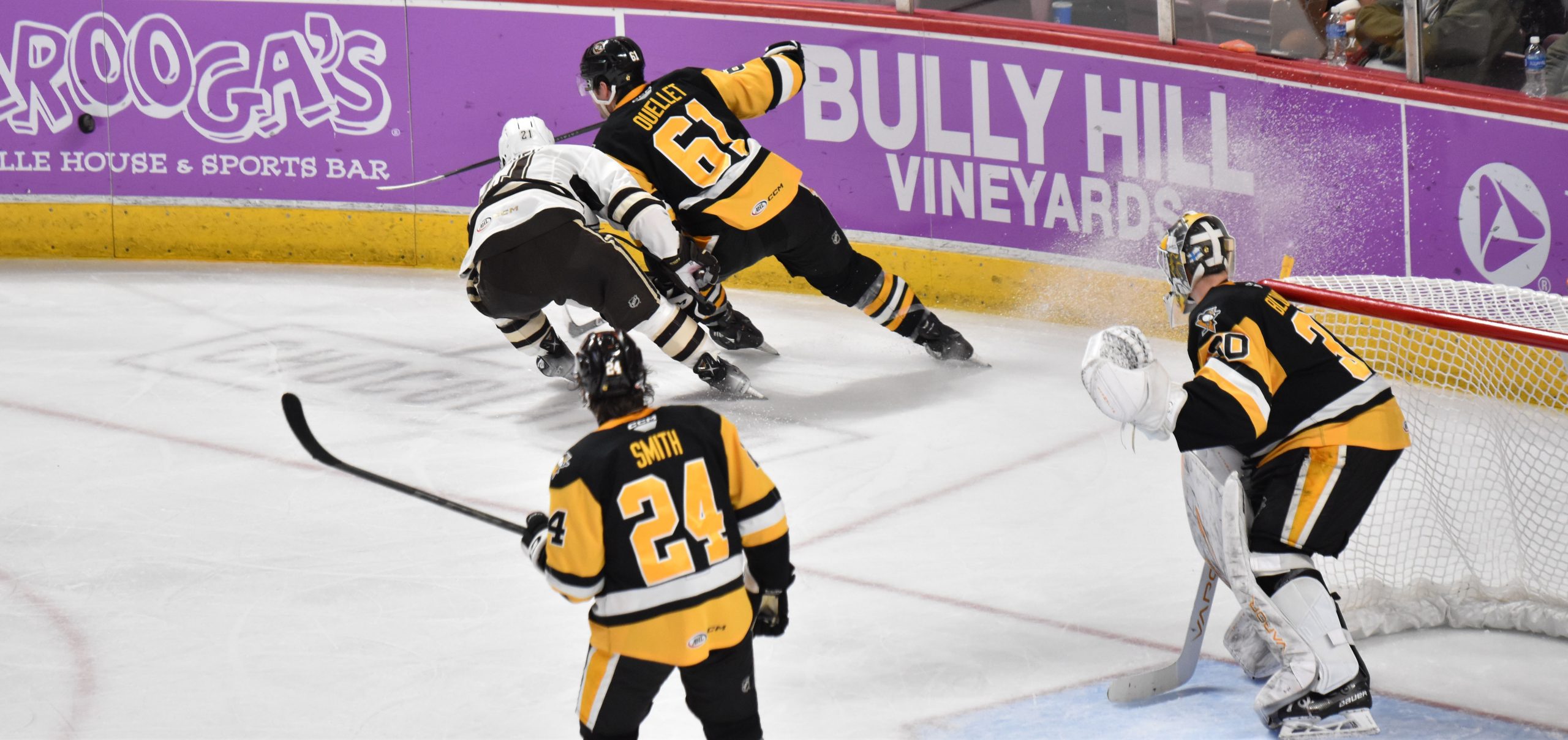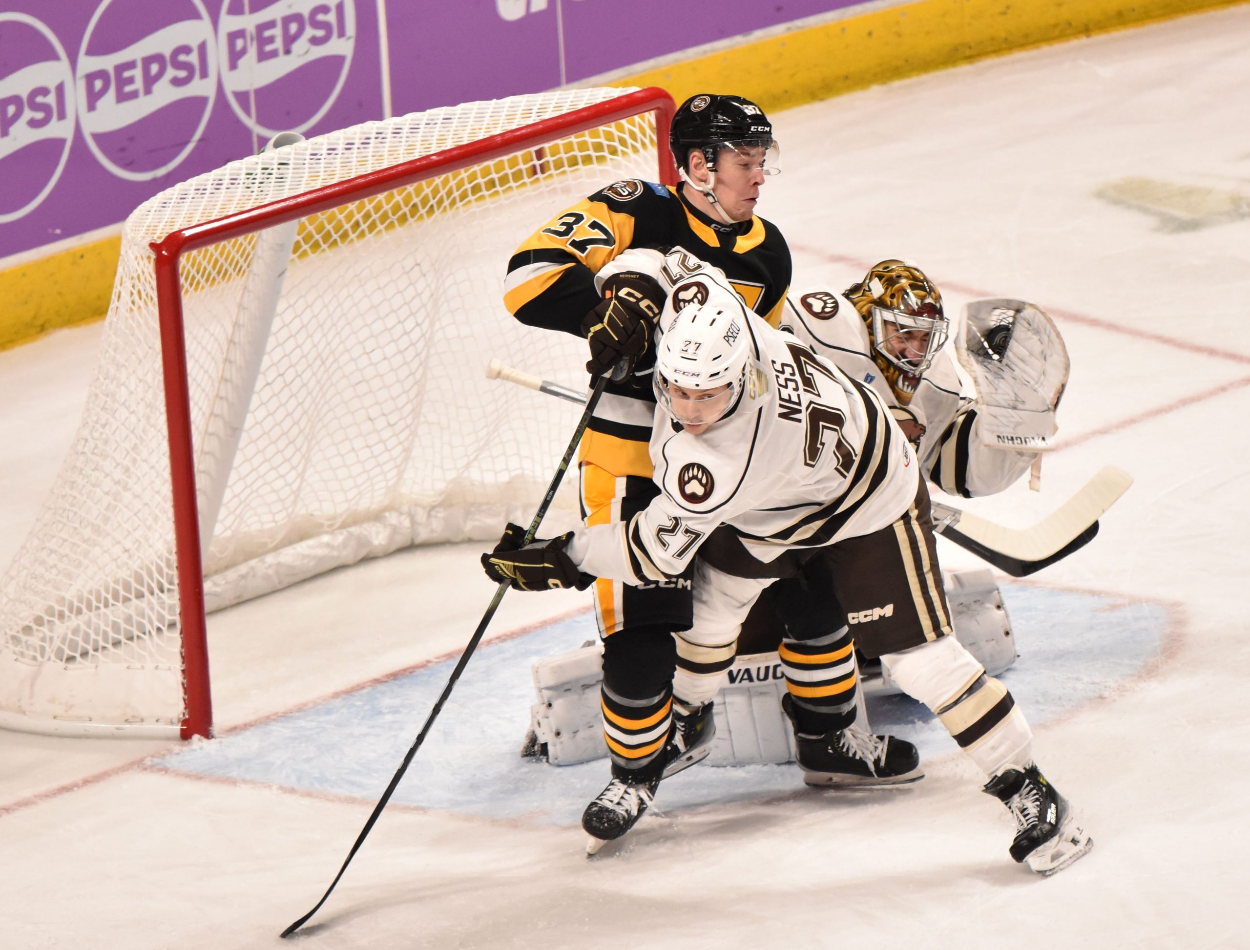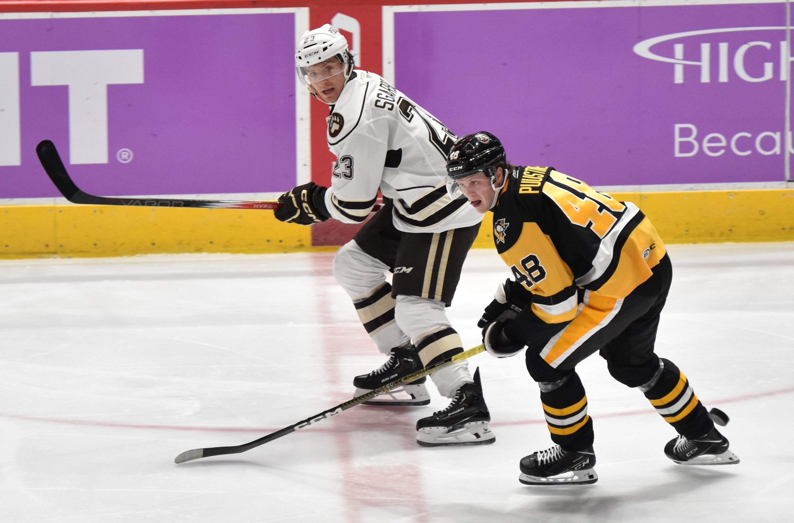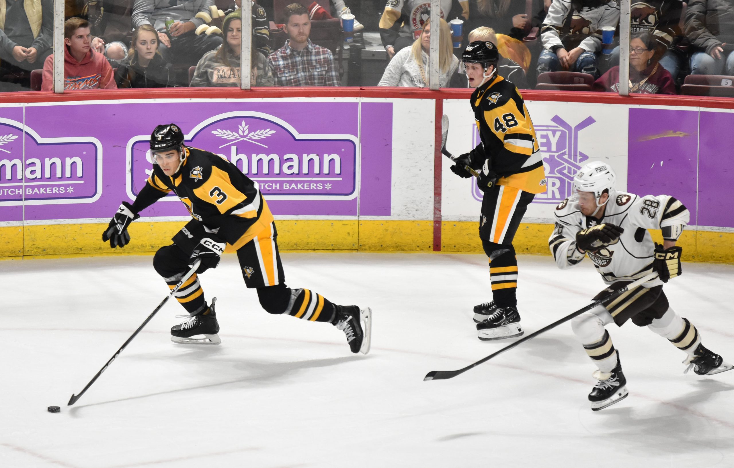Riley Sutter broke a 1-1 tie in the second period to give the Hershey Bears (13-4-0-0) a 2-1 Thanksgiving Eve home win over the Wilkes-Barre/Scranton Penguins (8-6-2-0) on Wednesday night in front of a crowd of 9,259 at GIANT Center. Hershey improved to 3-2-0-0 in the season series with Wilkes-Barre/Scranton with the victory.