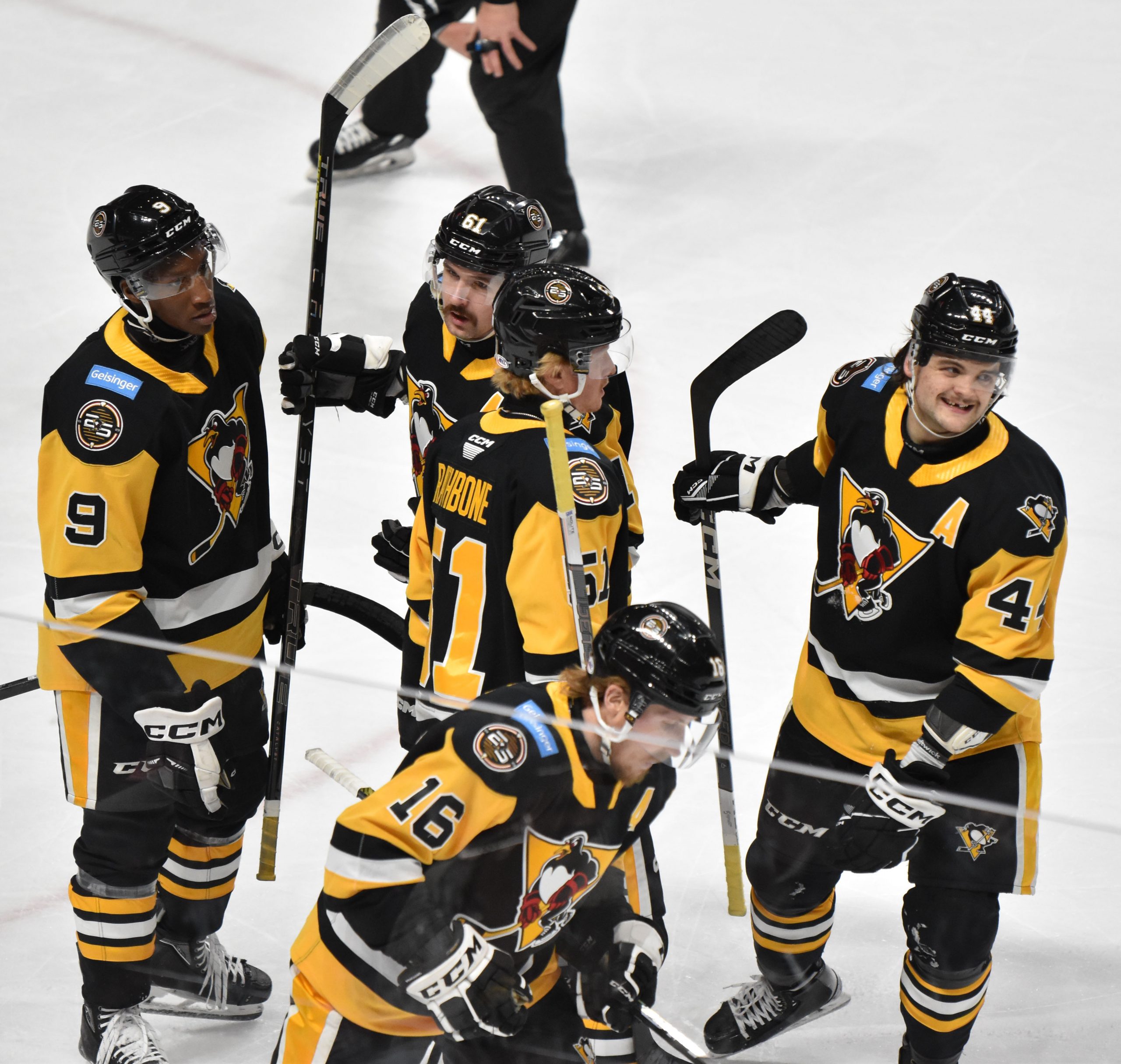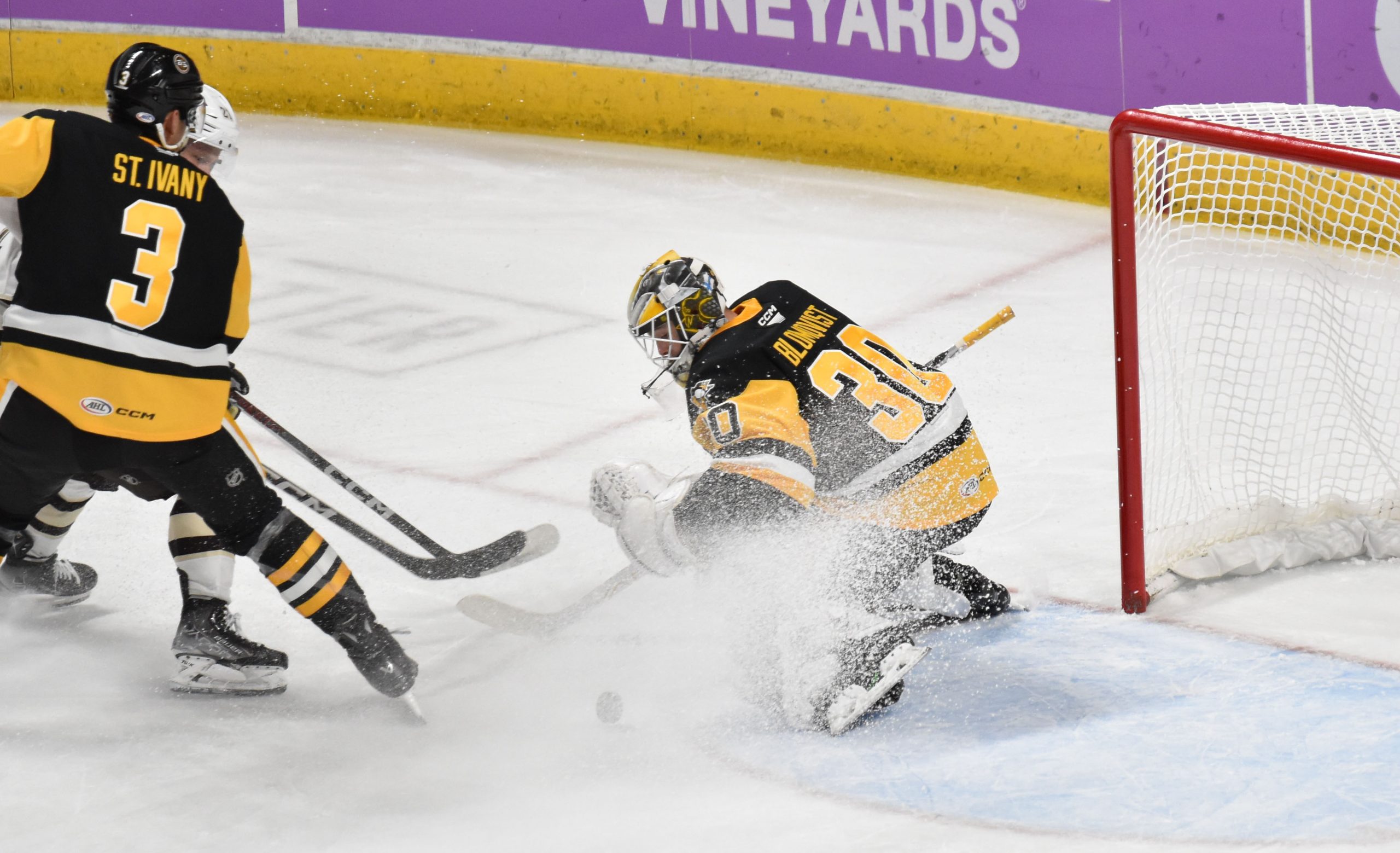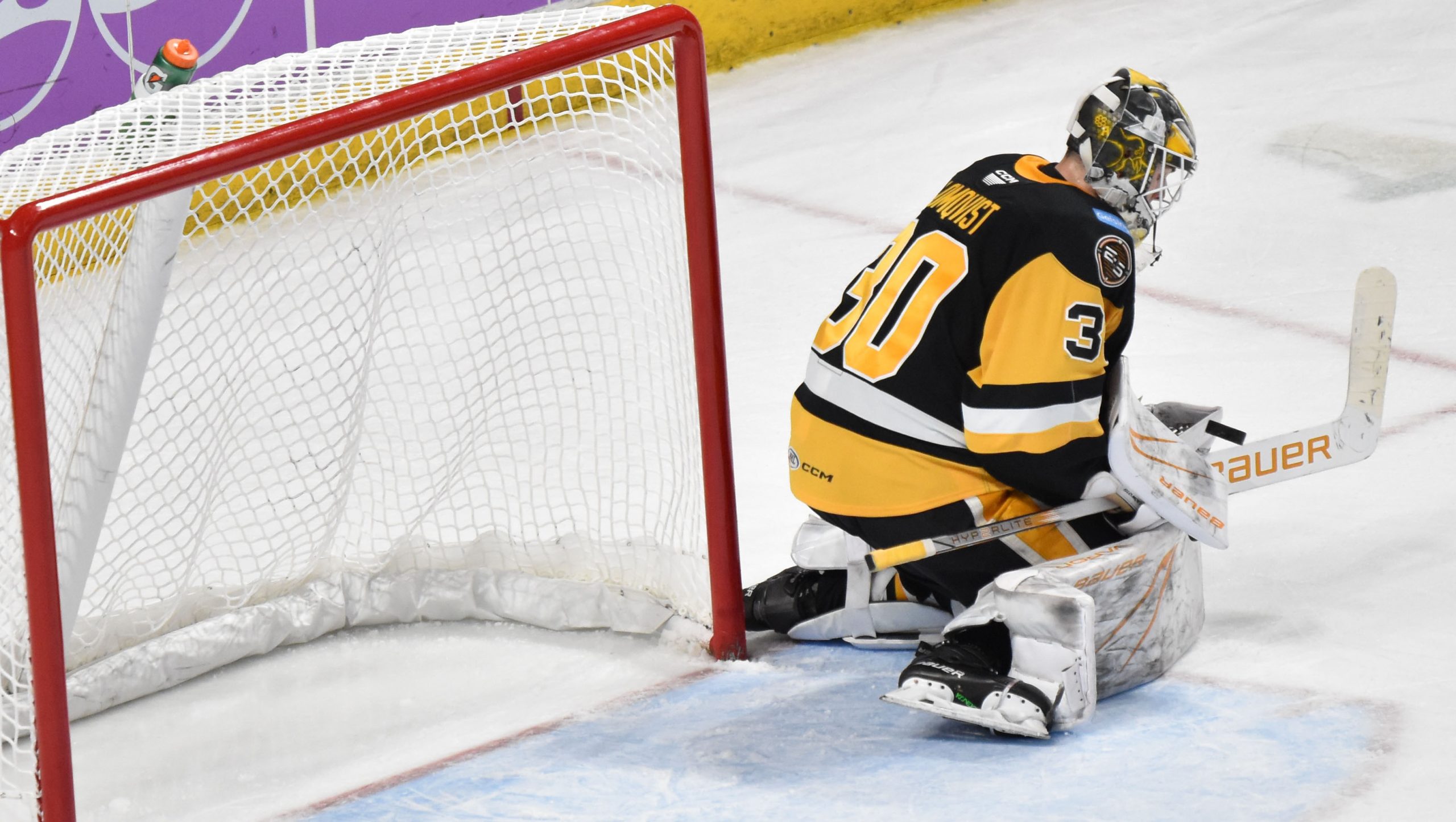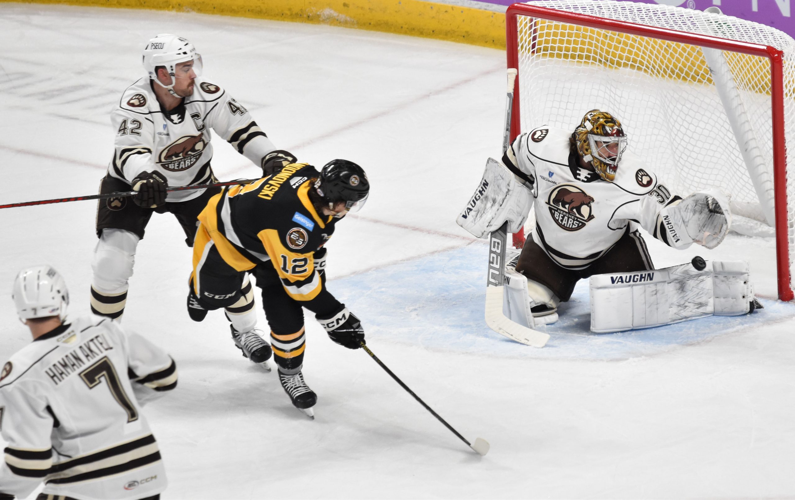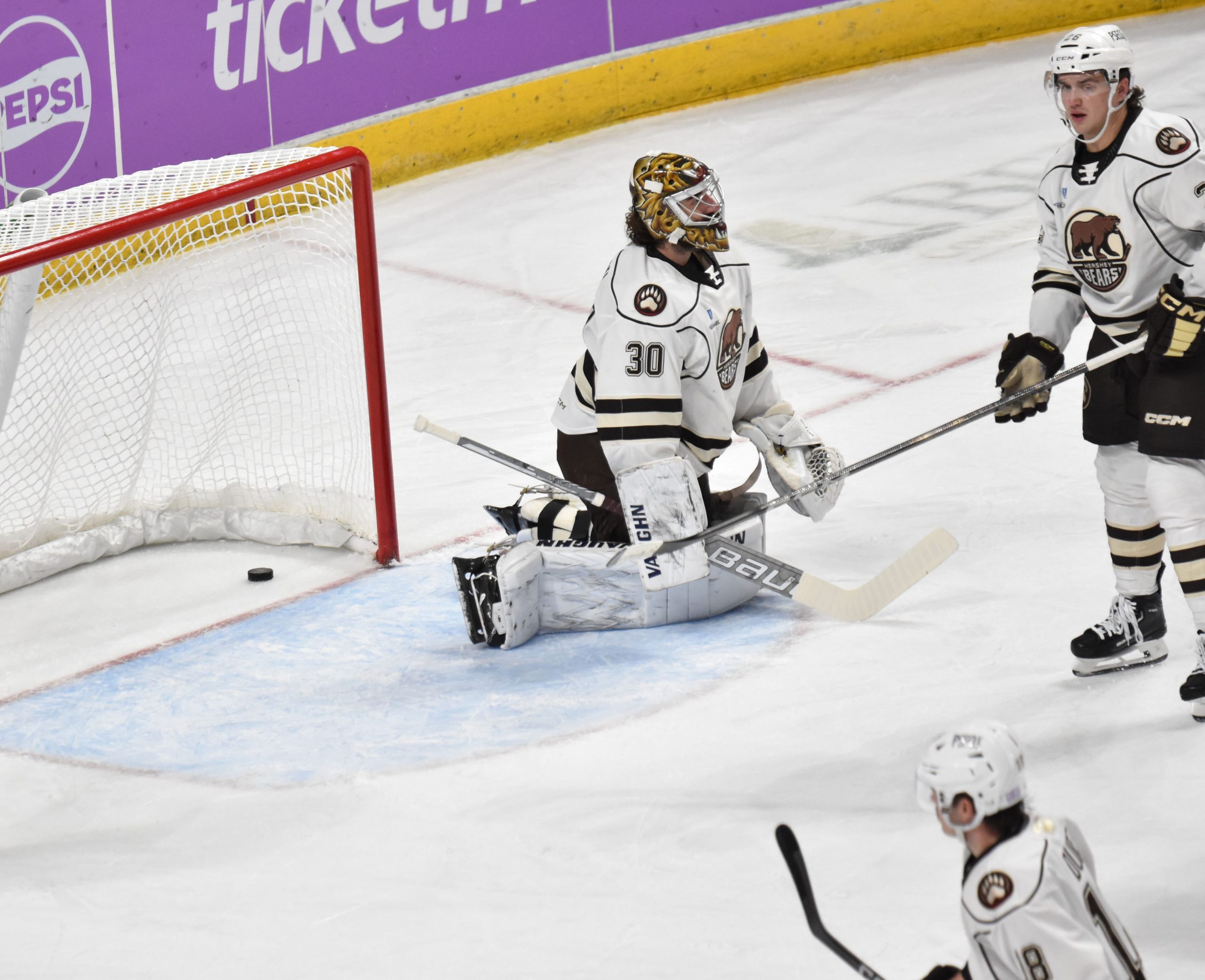 Hershey made it 2-1 early in the second period, as Riley Sutter redirected a behind-the-back pass by Ivan Miroshnichenko from beneath the goal line over the arm of Blomqvist at 2:52, with Hardy Haman Aktell collecting a secondary helper. Sutter’s tally marked his second consecutive game with a goal, the first time in his career he had scored in back-to-back contests.